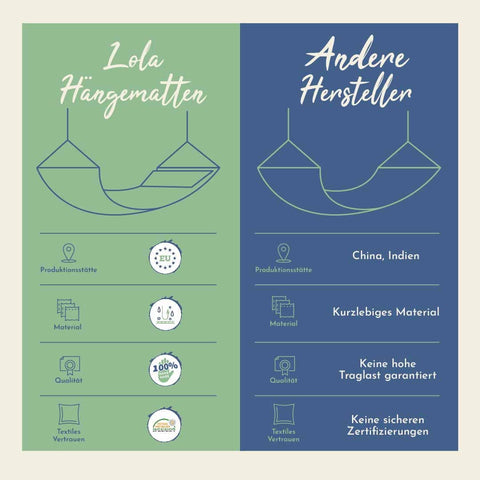 Unsere Hängematten setzen Maßstäbe in Qualität und Nachhaltigkeit. Während viele Hängematten aus Indien oder China kommen und lange Transportwege haben, produzieren wir in Europa. Das garantiert höchste Verarbeitungsqualität und einen geringeren CO2-Ausstoß. 💨 ♻️