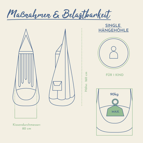 Sollte die Hängehöhle einmal im Regen hängen bleiben, ist es wichtig, sie danach vollständig trocknen zu lassen. Andernfalls kann die Langlebigkeit des Produkts nicht garantiert werden, und aufgrund des natürlichen Baumwollstoffes besteht das Risiko der Schimmelbildung.
