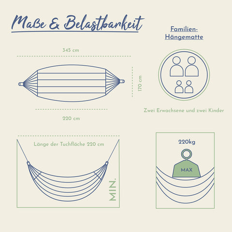 Die Safari Zebra Tuchhängematte Bio-Baumwolle ist speziell für Familien entwickelt. Sie bietet ausreichend Platz für bis zu zwei Erwachsene und ein Kind und hält problemlos einem Gesamtgewicht von bis zu 220 kg stand. Die Hängematte ist robust und langlebig, sodass du und deine Liebsten gemeinsam entspannen könnt, ohne Kompromisse bei der Sicherheit einzugehen. Achte dennoch darauf, dass das Gesamtgewicht der Personen und eventueller zusätzlicher Ausrüstung diese Grenze nicht überschreitet.