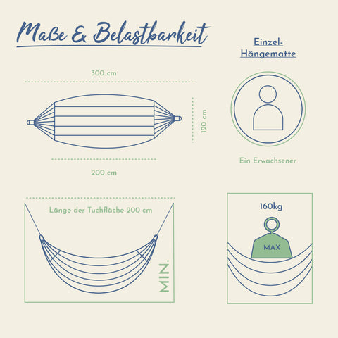 Unsere Hängematten sind zwar wetterfest, aber es ist wichtig, sie nach Regen oder bei Nässe zum Trocknen aufzuhängen. Bei mehreren aufeinanderfolgenden Regentagen oder niedrigen Temperaturen kann sich sonst Schimmel bilden.