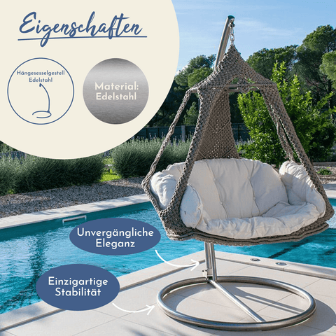 Das Hängesesselgestell kombiniert modernste Fertigungstechnik mit hochwertigen Materialien. Der polierte Edelstahl verleiht dem Gestell nicht nur eine edle Optik, sondern sorgt auch für maximale Langlebigkeit und Korrosionsbeständigkeit.
