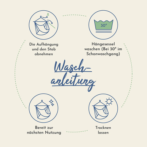 Der Hängesessel kann bei Bedarf mit einem feuchten Tuch abgewischt werden. Bei stärkeren Verschmutzungen empfehlen wir eine Handwäsche oder eine schonende Maschinenwäsche im Schonprogramm. Beachten Sie bitte die Pflegehinweise auf dem Etikett.