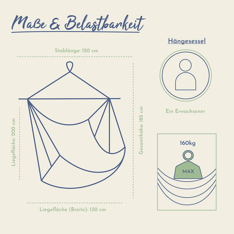 Der Hängesessel ist für eine Person ausgelegt und bietet optimalen Komfort und Unterstützung für einen entspannten Sitz.