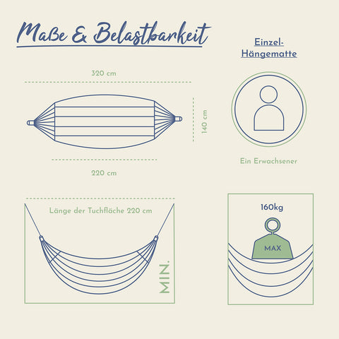 - 🌟 Geräumige Einzelhängematte: Mit einer Tuchfläche von 220 cm x 140 cm bietet sie ausreichend Platz für entspannte Stunden.