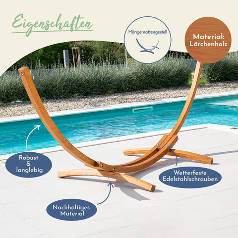 Das Lärchenholzgestell ist mit einer speziellen Tauchbadimprägnierung versehen, die es absolut wetterfest macht. Zudem verwenden wir hochwertiges, FSC®-zertifiziertes Lärchenholz, das für seine Langlebigkeit bekannt ist. Bei richtiger Pflege und Nutzung kann das Gestell viele Jahre halten und ist somit eine robuste und nachhaltige Wahl für Ihre Hängematte.
